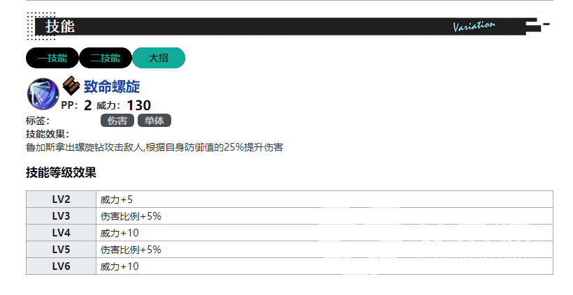 鲁加斯的大招致命螺旋,威力值为130,技能最高可升至6级,6级之后威力会增加25点,伤害比例提高10%,该技能会丢出螺旋钻来攻击敌人,并且根据自身防御值的25来提升伤害。