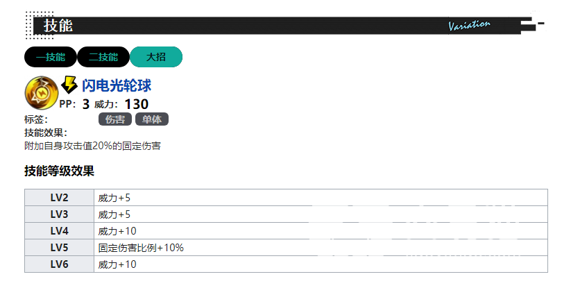 利利大招闪电光轮球,技能威力值130,释放该技能之后,会附加20%的固定伤害值。技能升级至6级之后,威力值会增加30点,附加固定伤害增加10%。
