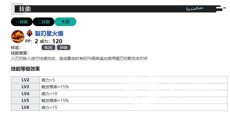 火刃的大招裂刃星火爆,威力值120,发动该技能时,火刃会快速攻击敌方单位,当暴击率达到80%的时候会有追加效果,使用锯刃切割进行攻击。技能等级最高可升至6级,6级之后威力增加30点,附加技能触发机率增加30%。