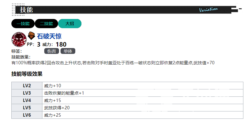 盖亚的大招石破天惊,威力值180,该技能有100%的机率会获得两个回合的攻击上升状态,如果击杀敌时盖亚处于百炼一破状态的话会立即回复2点能量点,武力值增加70,是属于高伤害的大招,而且后续技能升级之后伤害会更高。