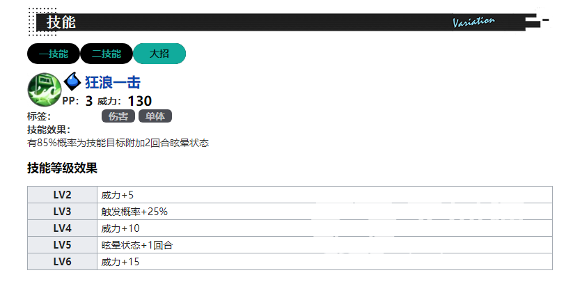 巴拉龟的大招狂狼一击,威力值130,该技能效果是可以直接对敌方单位造成高伤害的,除了伤害爆棚,这个技能还会带有眩晕效果,而且触发机率高达85%,可以持续两个回合。当技能升级至6级,威力值增加30点,眩晕效果触发概率增加20%,持续3个回合。