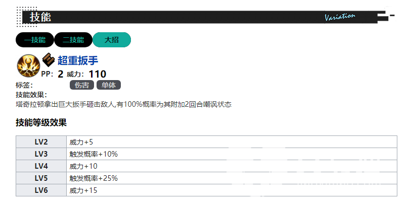 塔奇拉顿的大招超重扳手,威力110,该技能效果是通过扳手对敌方造成伤害,且可附加2个回合的嘲讽状态,触发概率为100%。当技能升至6级之后,威力值增加30点,等级越高伤害越大。