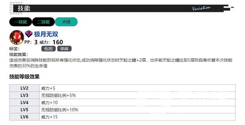 缪斯的大招极月无双,威力值160,缪斯的大招会消除敌方目标所有的强化形态,并且会叠加2层天蛇之瞳,当出手前天蛇之瞳达到5层的时候会回复自身30%的生命值。当技能升级至6级之后,威力值会增加30点,伤害也会更高。