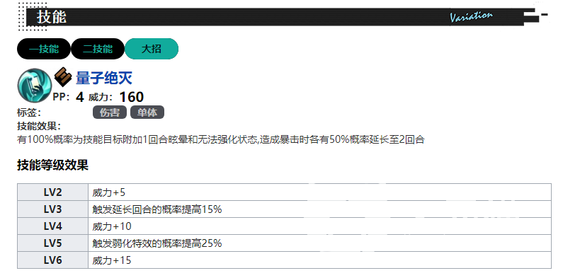 卡缪斯的大招量子灭绝,威力值160,该技能会为敌方目标单位附加1个回合的眩晕效果以及让对方无法完成强化状态,概率为100%。而且再完成暴击时,眩晕和无法强化的状态可以持续2个回合,机率为50%,技能等级达到6级时,该机率为85%。