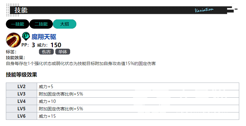 魔师迪露的大招魔翔天驱,威力值150,技能升级最高为6级,技能升到6级之后,威力提升至180,而且附加的固定伤害会在原有的15%基础上再增加10%。