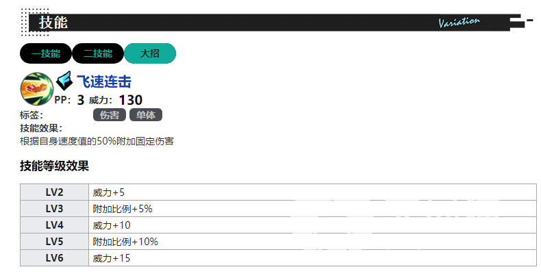 灵翼蜂的大招飞速连击,威力值130,该技能效果会依据自身速度值的50%对敌方单位附加固定伤害,当技能等级到达6级之后,威力值增加30点,附加固定伤害增加15%。
