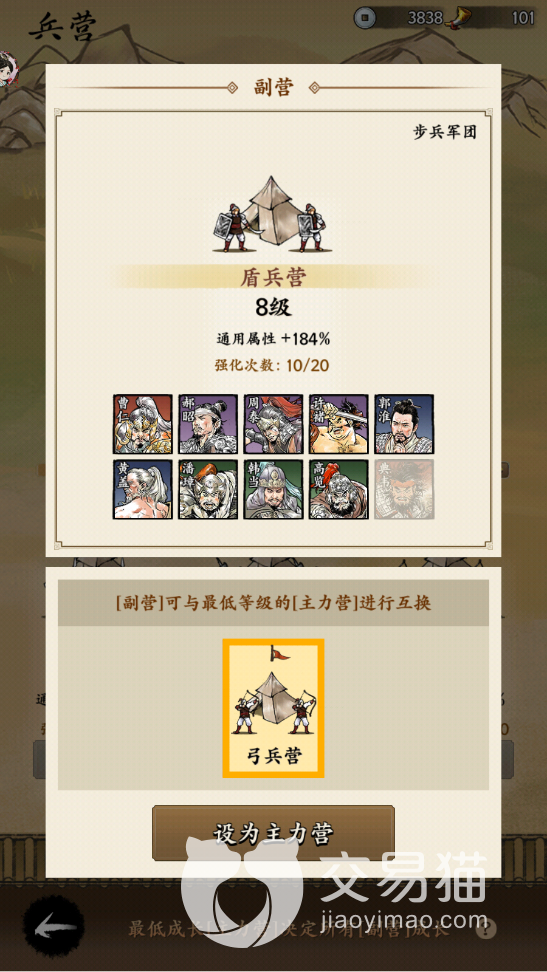 其实在游戏中大家可以在兵营里看到所有的兵种,这些兵营就是代表了各个兵种,每一个位玩家可以设立三个主力营,其他的兵种就是副营,在主力营升级的时候副营也会有相应的武将属性提升,但是主力营肯定是更加厉害的,所以要根据大家平时在战斗中喜欢使用的兵种组合来看主力营要发展哪几个。