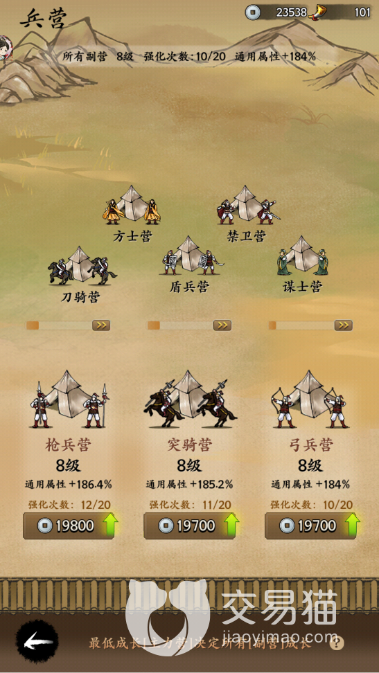刚开始的兵营都是一级,每一级在强化了20次之后就可以升一次级,升级就需要突破,强化需要株钱,而突破则是需要消耗军功,所以想要升级成为二阶兵种,这两个道具一个也不能少,其次就是大家要注意,在主角等级不够的时候,也会延迟突破的时间。