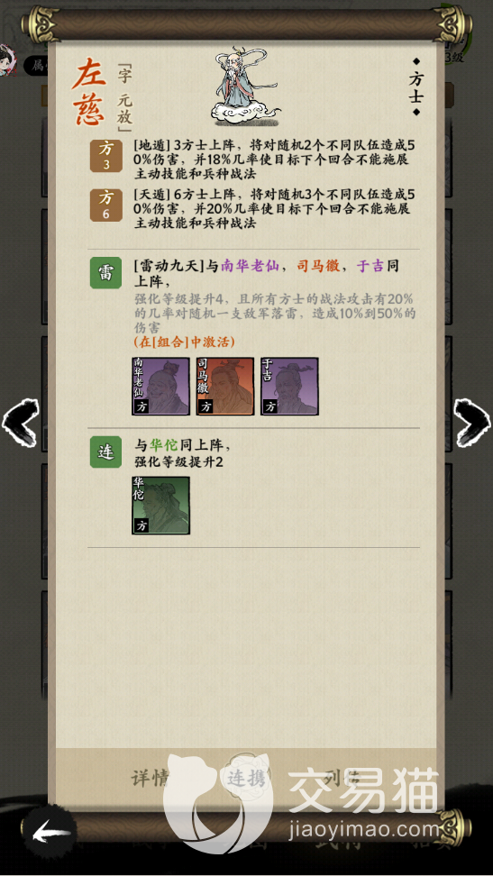 在左慈受到最后一击的时候会触发这个效果,百分百避开这一次的攻击,相当于保住了一条命,不过这个技能的触发次数一场战斗中只有一次,所以要是后续有其他对手攻击跟上的话,左慈还是会被击倒,其实左慈这个角色主要是可以跟其它武将好好搭配,造成的雷动九天组合也是有伤害加成的。