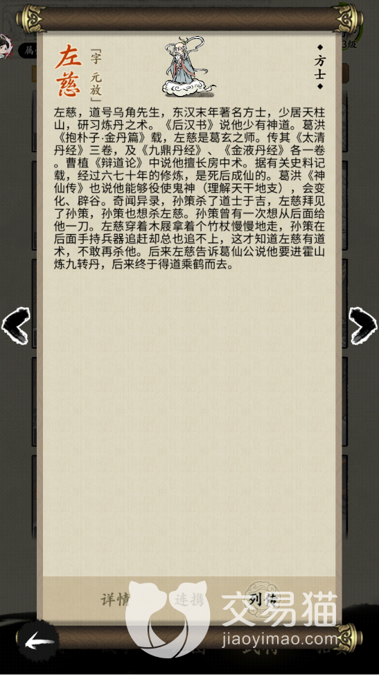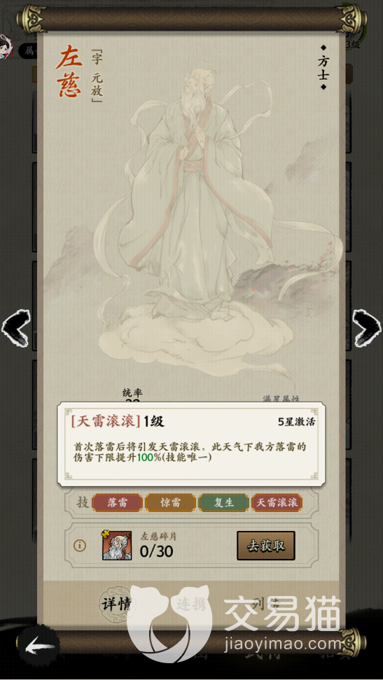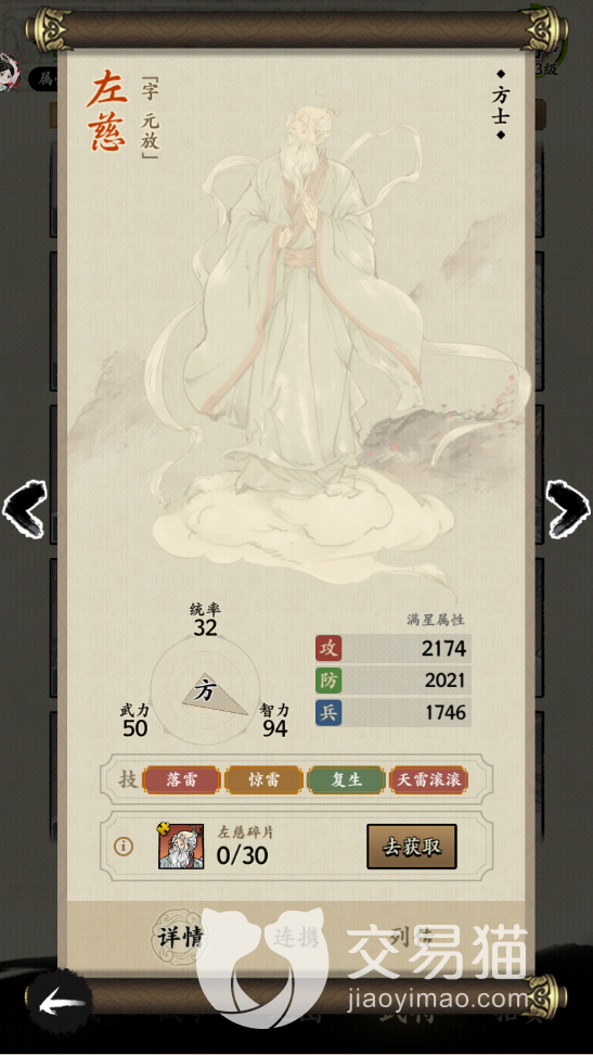 要是想要获取左慈的话,十连抽获取的几率要大一点,或者是去心愿武将中看看有没有左慈,因为左慈毕竟是一个绝品品质的角色,所以小编还是比较推荐大家获取的,左慈是一个方士定位的武将,所以武力值不算高,但是相比其他品质的方士武力值已经算高的了,有50点数值。
