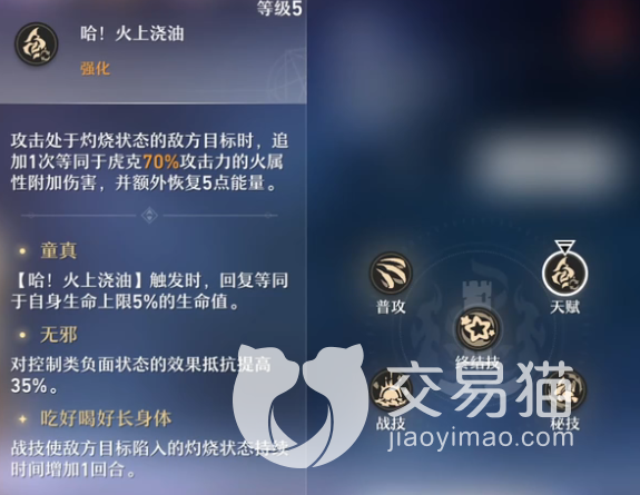 最后一个秘籍也是可以带来灼烧效果的一个技能,这个技能在使用的时候,敌人会受到虎克50%的火属性伤害,与此同时如果触发了灼烧效果的话,这个效果会持续三个回合,所以其实虎克的几个技能用来做输出也是非常不错的。