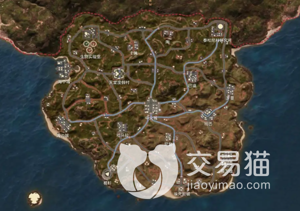 然后就是阿金塔这个地图了,这是个半岛地图,大家可以看到中央城的面积很大,而且一般来说比较容易跑毒,所以跳这里的玩家很多。另外海中城、海边城、莫万迪、研究所这几个地方也有很多人去,资源挺不错的。这张地图的资源点比较分散,对大家的跑图有要求,而且比较空旷,要注意找好掩体。
