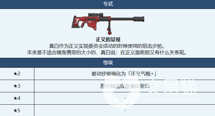 真白的定位是爆发,她的专属武器“正义的显现”十分的强大,在升级到三星的时候,还可以提升角色在野外的适应性哦,这让真白成为了当之无愧的“野战之王”。