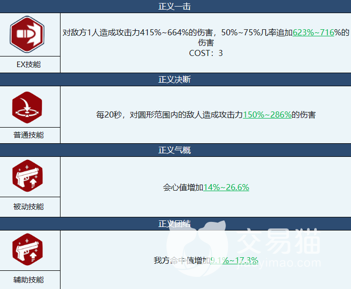 真白的技能同样也很“超模”,首先是ex技能正义一击,可以对他敌方的单体单位造成巨额的伤害,同时还有很大的概率追加双倍伤害哦!在高难本中具有不俗的出色表现。被动技能以及辅助技能则可以提升暴击率以及命中率,互相叠加之下,可以说,没有哪一位角色的瞬间爆发可以超越真白了。