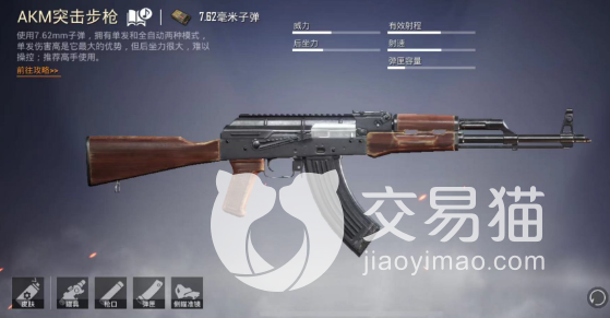 之后则是M16A4的“反向”步枪,苏联味满满的AKM,AKM的优点与缺点和M16A4完全相反,这款步枪有着较慢的射速以及非常恐怖的后坐力,但是威力却是极大的哦,在近距离战斗的时候,甚至连冲锋枪都会吃亏,但是因为恐怖的弹道散射的原因,还是推荐老手们进行使用哦!