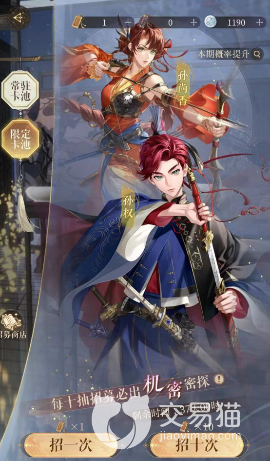 需要注意的是,游戏里面的不同卡池不共享保底次数,保底次数按卡池独立计算。比如孙权与孙尚香的江东卡池里面,两个活动限定角色在该卡池里获取概率提升,玩家不能将普通卡池的抽数继承到这一个活动卡池中。