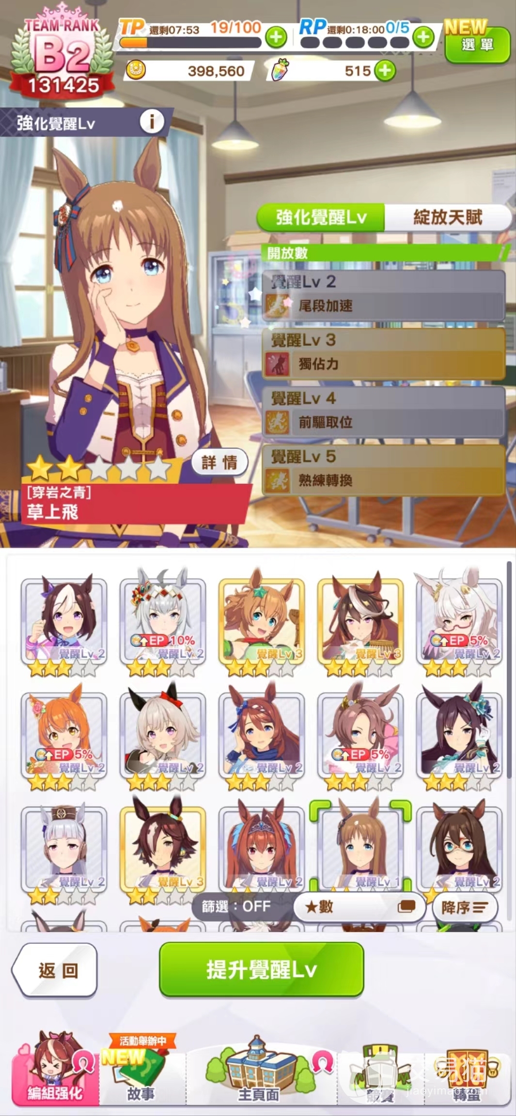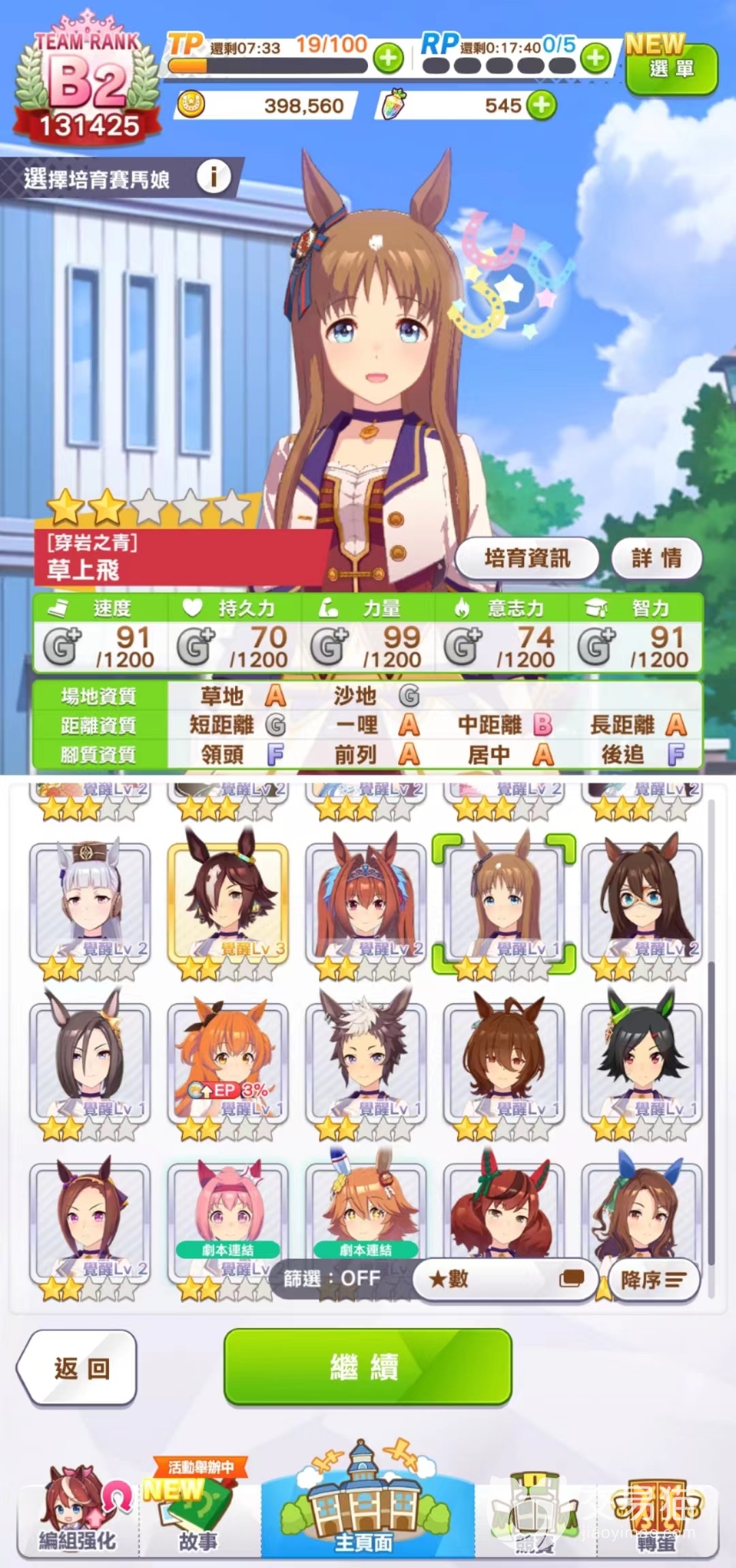 因为达比是中距赛,所以开始要多点一些耐力练习,体力不够高的话也要点一下回复技能,没回体技能的话体力至少耐力要300。