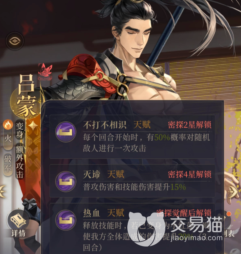 吕蒙是火属性破军角色,特点有变身与额外攻击,每回合初以及释放大招有几率变身成为扬州小红莲,通过洗命盘可以让变身属性与变身概率提升,不论是打群体aoe还是给火队加额外伤害都得心应手,是一位后期培养起来非常强的角色。