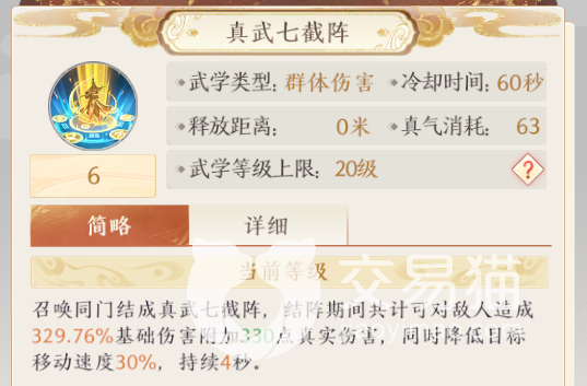 真武七截阵:武当派最具代表性的技能之一,使用之后会召唤七个同门共同组成剑阵,之后会对范围内的敌人造成高额的群体伤害,这个伤害不只有内功伤害,而且还会附带一定的真实伤害,无论是脆皮还是肉盾都将被显著削减血量。