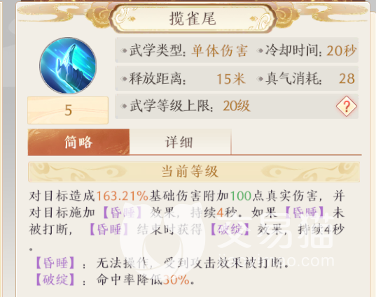 揽雀尾:这是cd仅有二十秒的一个单体技能,使用后会施加单体伤害和昏睡效果,它本身的伤害也是附带一定真实伤害的,因此无需担心打不动人,而且昏睡会持续足足四秒,如果被其他伤害打断也无伤大雅,因为之后会附加额外的破绽效果,从而大幅削弱敌人命中。
