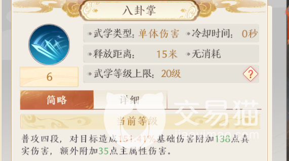 八卦掌:这同样是一个单体伤害技能,而且没有消耗,没有冷却时间,在实战中使用的频率很高,会同时附加基础伤害,真实伤害和主属性伤害!