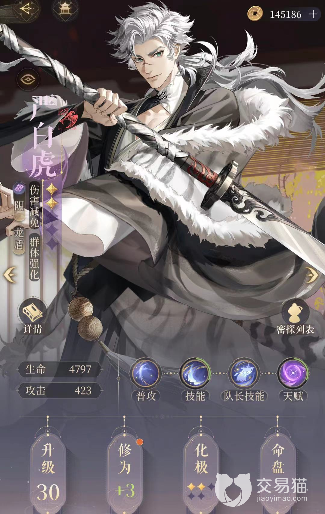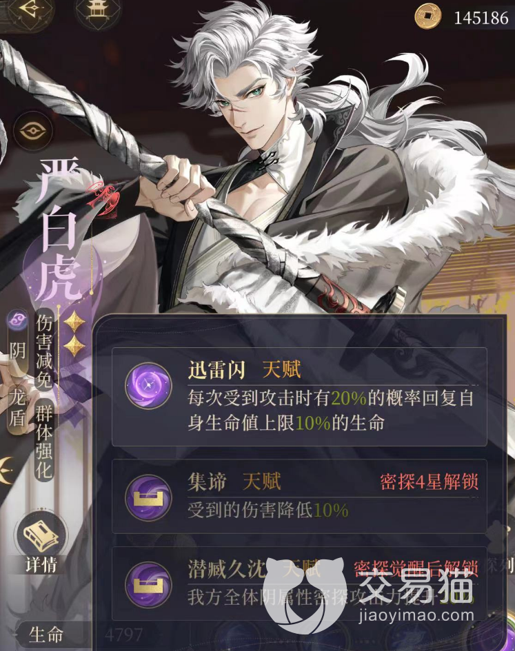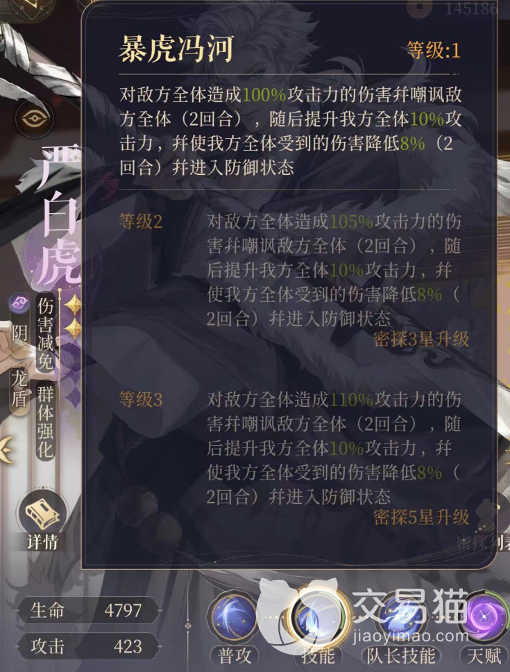 4星解锁集谛,严白虎受到的伤害降低10%。减伤只针对于自身,感觉没有颜良的吸收伤害护盾好用。