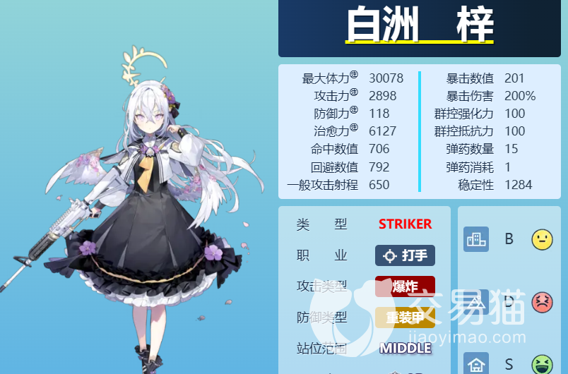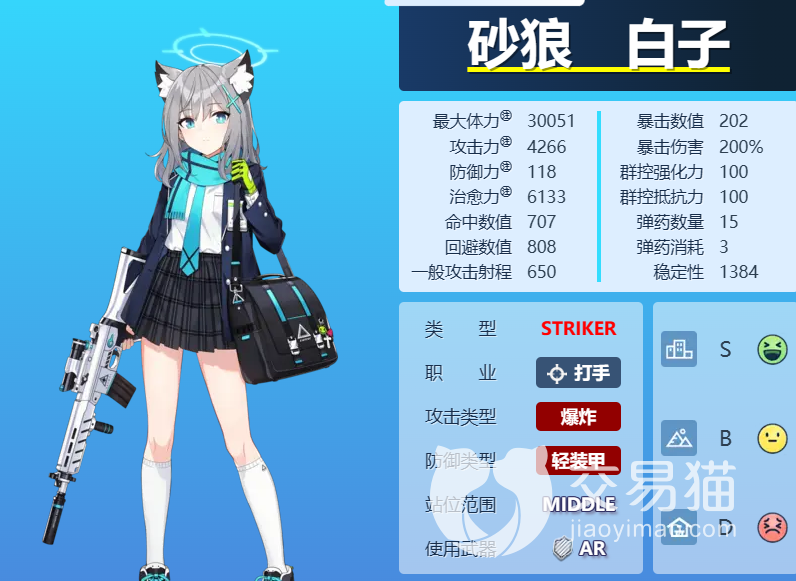 砂狼白子在游戏中的出场非常的早,基本是在玩家进入游戏的第一天就能和她见面。有很多玩家因为她狼耳的特殊属性所以感觉被戳到了萌点。喜欢运动的白子性格异常沉默寡言,但隐藏在冷漠表面下的是比任何都想要振兴学校的决心。白子的战斗技能是召唤无人机,在一名敌人死亡之后会继续对范围内的下一位敌人造成伤害,在所有角色中是伤害排名靠前的一位,所以白子的粉丝大多也是被她的强度吸引而来。