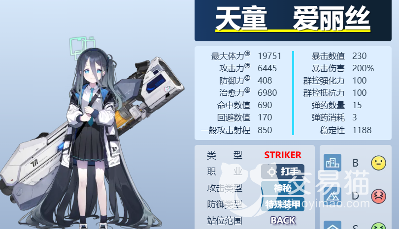 被桃井和绿在废墟中发现的爱丽丝是一名机器人,为了让游戏开发部拥有一定数量的成员,其他人把爱丽丝的信息录入了千年科学学院。关于爱丽丝,一切情报都是未知状态,甚至连年龄也是未知。由于爱丽丝失去了记忆,所以经常模仿学习其他学生的语言,说话工程中会蹦出游戏音效,有意思的是爱丽丝会在垃圾桶中翻找稀有道具。爱丽丝的基础攻击力非常高,普通攻击会对一条直线上的敌人进行贯通设计,强劲的输出以及说话时有意思的细节都大大满足了玩家们对机械姬的好奇。