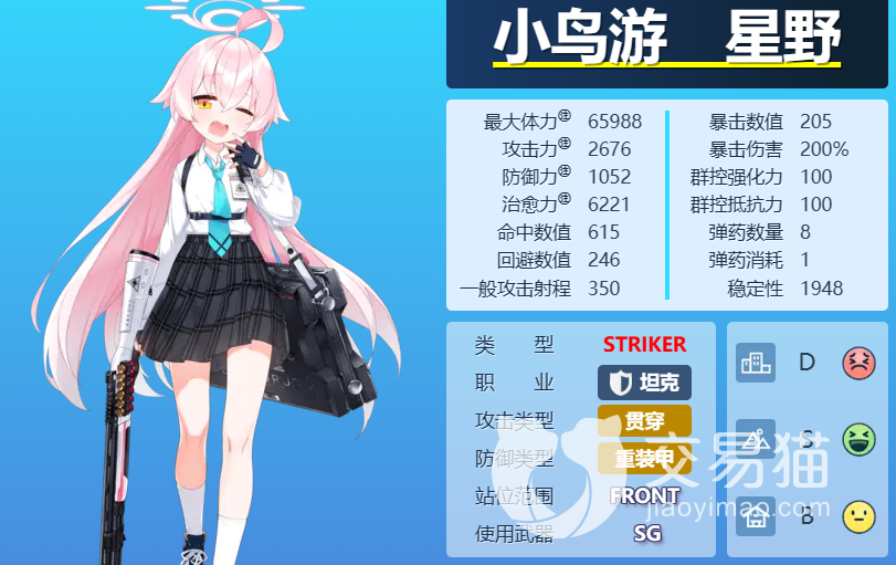 和伊吕波一样,小鸟游星野在阿拜多斯的对策委员会组织中也担任着懒惰虫的角色。即使拥有着异瞳和娇小身材的可爱外表,却喜欢用大叔的口吻说话因此被玩家们戏称水大叔、比起认真的应对公务,小鸟游星野更喜欢恶作剧,所以总是被比自己小的其他成员训斥。即使是这样,一旦危机来临,小鸟游星野总是第一个站出来保护同伴。这样的她在游戏中的定位是坦克,但与普通坦克不同的是小鸟游星野能打出巨额的伤害,在任何地图的登场率都很高。