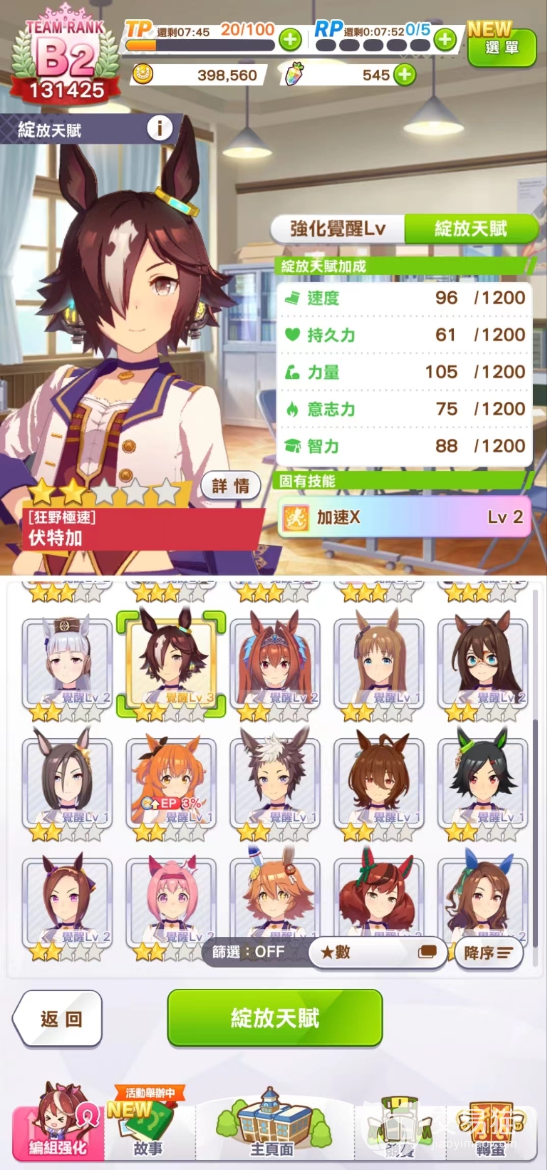 伏特加不能只玩速智流,因为她培育目标中还有一些中长距离的比赛要跑,所以力量和耐力都要兼顾。一开始出道战,先升速度和力量,哪个人多选哪个,如果人比较少可以选择外出提高一下干劲。