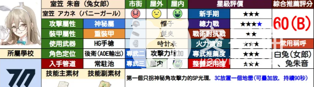 关于应用场景的问题,朱音(兔女郎)并不擅长在户外地形作战,但在室内战的表现非常优异,玩家们在迎战重装甲和轻装甲的敌人时建议避免使用朱音(兔女郎),可以考虑换成其他角色,避免伤害无法打出造成的战斗绝境。