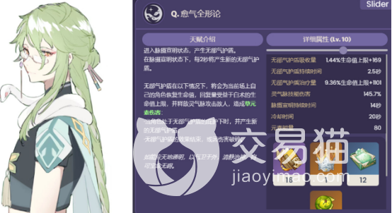 1、普攻,可以给敌人带来草附魔。他的E技能能够给敌人带来草元素的伤害,如果对敌人进行了三次攻击,或者是附近已经没有了敌人。那么就能够给全队的人员进行治疗,并且治疗效果是非常强悍的。