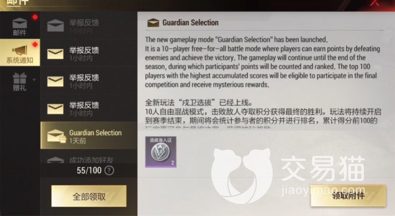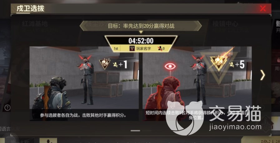 然后我们来重点讲讲这次的新模式“戍卫选拔”,先将邮件中送个2个硬币领取了,然后拿起装备去试试手。该玩法中玩家都是独立个体,也就是说是一个混战模式,大家各自为战,通过击杀其他敌人得到积分。如果在很短时间内5连杀,积分会更多,但也会暴露出自己的位置。