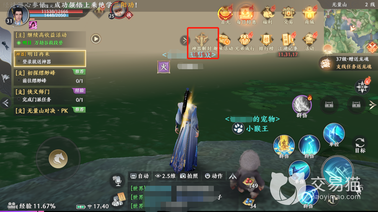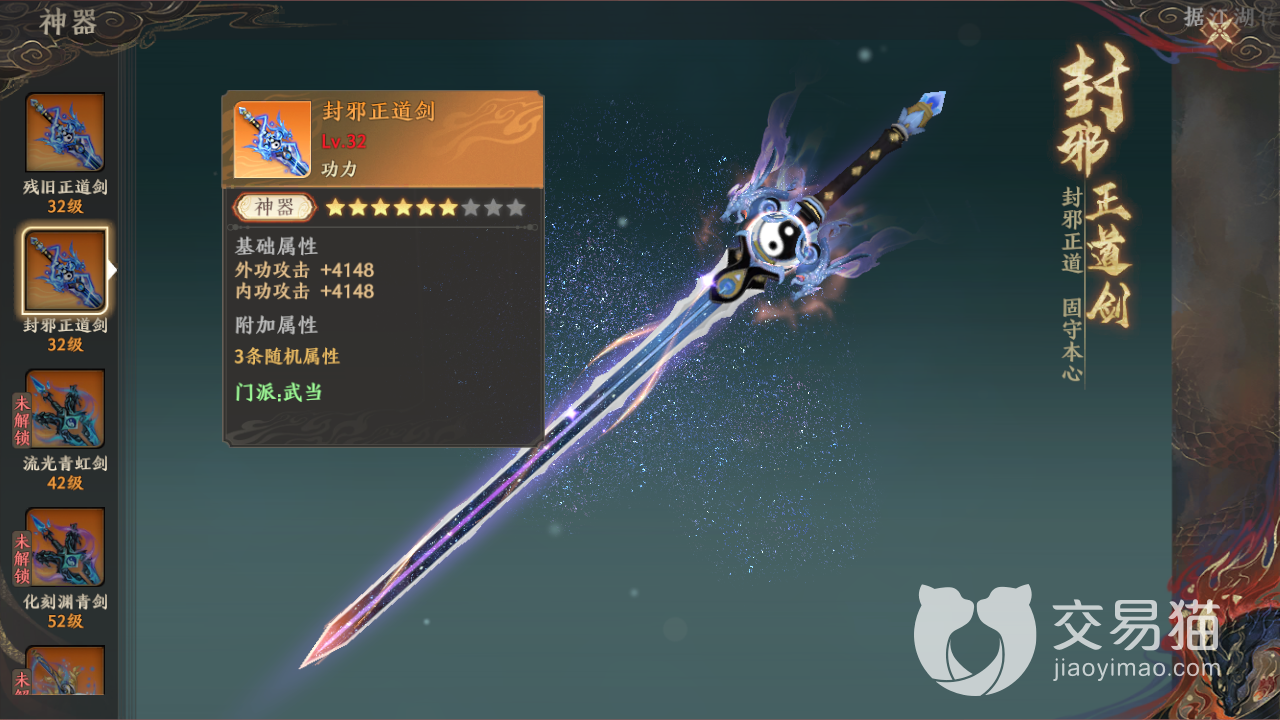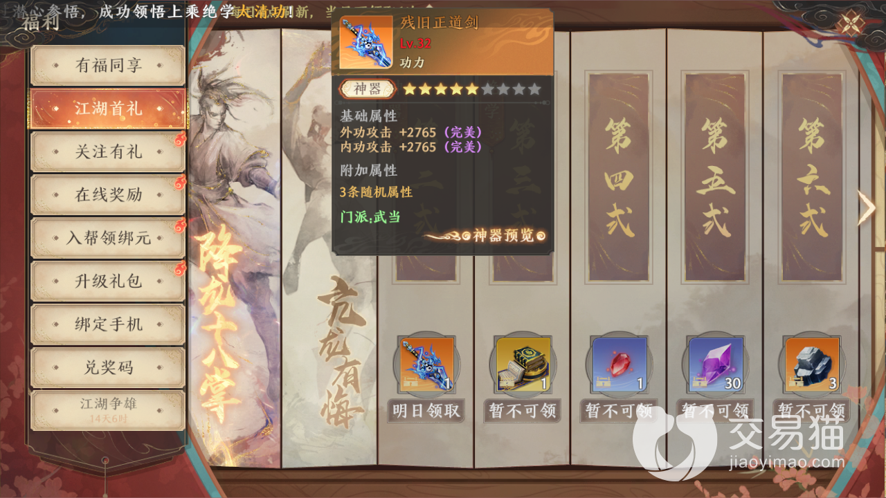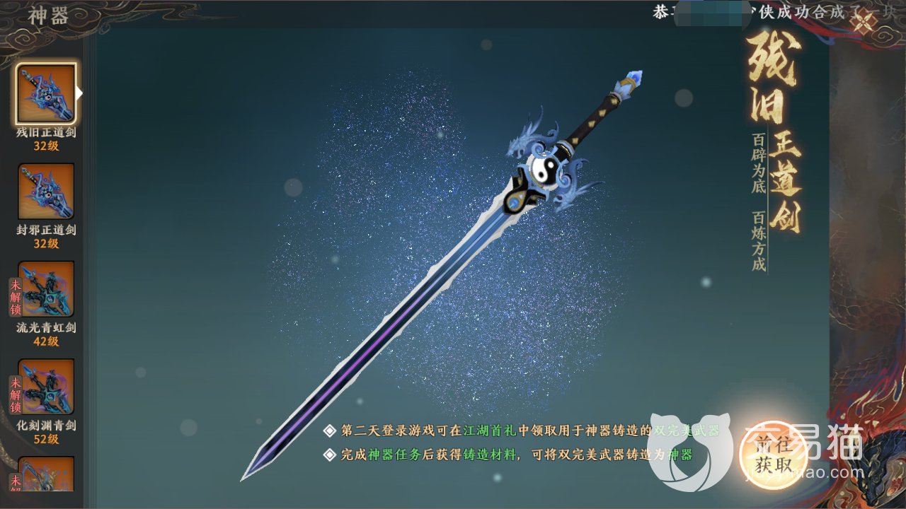 同时你的任务栏和屏幕上方也都会出现神器解封的相关信息,不过也无需等24小时,只要在第二天零点的时候上线即可进行解封,神器的类型多种多样,但基本都还是以武器为主,当然,不同的门派可以获取的神器种类也会有所差别,这里小编用的是武当,所以里面基本也都是剑。