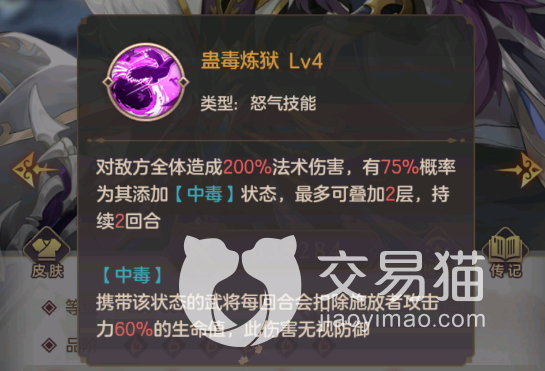 然后是技能攻击,这个是属于怒气技能,叫做“蛊毒炼狱”,在使用以后可以让敌方全体目标添加一个每回合都会扣除一定生命值的debuff,且无视任何防御,这个技能最多可以叠两层且只能持续两个回合。