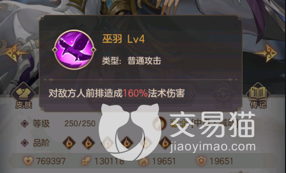 贾诩是一个群攻角色,有一个普通攻击、一个技能攻击和一个天赋加成,首先来讲普通攻击,它叫做“巫羽”,使用以后可以对敌对目标前排人员造成法术伤害。