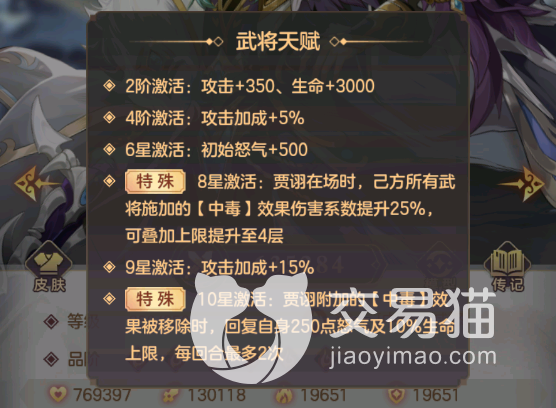 最后是天赋加成,这个需要玩家将贾诩进行升阶升星的养成才可以,每加成两阶都会获得额外加成,比如激活了2阶人物就会增加攻击和血量,升到6星则会增加初始的怒气值,让人物输出更快,且如果到8星甚至10星的话,只要贾诩在场,己方又有可以施毒的武将,那么中毒的效果、层数以及回合数都会提升。