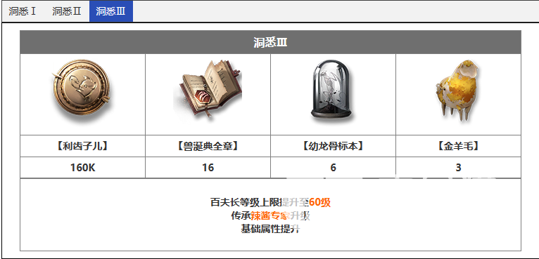 百夫长作为一名六星的角色,想让提升她的练度也是很耗费材料的,百夫长的洞悉材料为兽诞典残篇,清扫咒以及罗马金币,这些材料都比较好刷,只要玩家们日常清清体力,过过主线,将百夫长升到洞悉一阶段还是比较容易的。但是洞悉2阶段的“液化战栗”以及最后的三阶段的“金羊毛”就比较困难了,前者只有在1st-14【厄险】暴雨眼2nd-9 【厄险】珠光与弹痕3rd-6 黑羊之墙这三个副本中才会掉落,至于金羊毛的获取渠道则是特殊的,是不会在副本中掉落的哦,想要凑齐这些材料,玩家们就需要费一番苦功夫了。