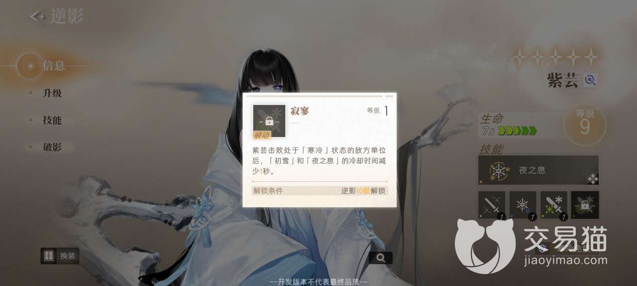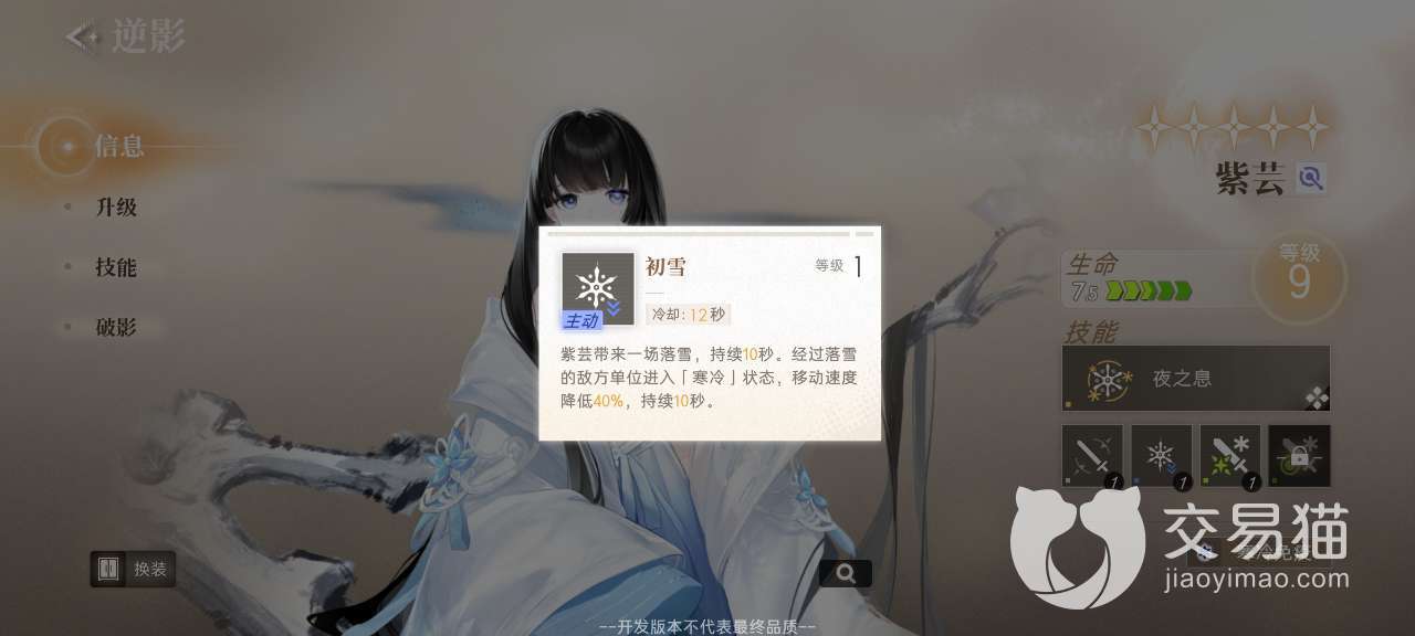 她作为一名高品质的角色,获取的方式虽然是抽卡,但是能够抽中的概率是比较低的,这个角色的技能有四个,其中一个叫做初雪,是主动释放类型的,效果就是场景会降临一场雪,此效果会持续十秒钟。