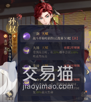 孙权属于火属性角色,拥有多次攻击的特点,属于单体爆发。孙权的天赋有4种,每一种都有独特的存在,比如第1种天赋三剑,在战斗的时候可以获得一点能量和三把剑。