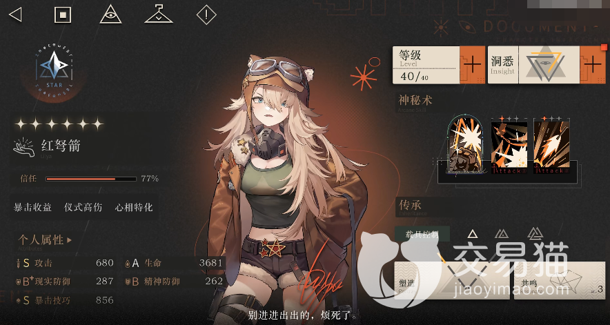 首先从属性来看,她的攻击和暴击技巧都已经达到了S的评级,这一层次几乎已经是游戏中最高的水平,有了它们的加持之后,玩家能够在实战中打出非常爆炸的输出,此外,红弩箭也并不怕暴毙,因为她的生命和双抗都还不错,虽然后者达不到很可观的水准,但两者结合之下再对比其他同类型角色,其实还是有中上水平的,而且在面板属性没显示出来的暴击收益上她也是十分高的,这就意味着同为输出角色,她比其他角色的爆发要高得多。