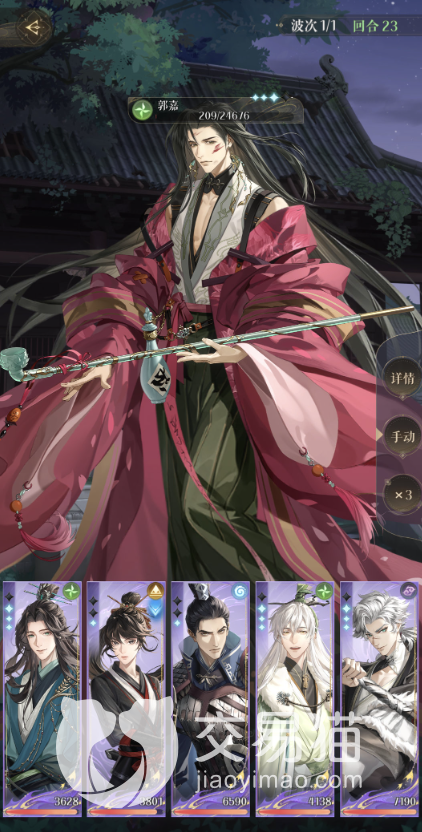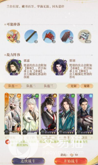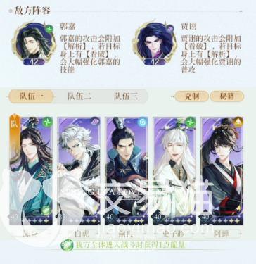在战斗的过程中,除了嘲讽技能之外,敌人的攻击是完全随机的,如果非常不幸阿蝉和史子眇最先死亡的话,小伙伴们可以重新打,必须保证在击败了贾诩boss之后,阿蝉、史子眇和任意一个盾能够存活,陈登只要不是开场死,通过的几率就能够大幅上升。
