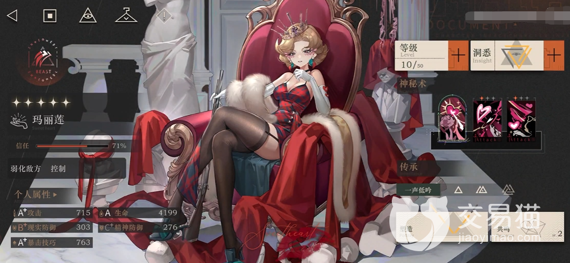 最后一个技能也是一个单体攻击的技能,这个技能目前也是玛丽莲最高伤害的技能,使用的死后可以造成的现实伤害有400%,这个百分比在输出角色里面还是比较高了,而且在带来伤害的同时,大家可以在上面减少20%的防御,不管是现实还是精神层马可能的防御都有哦,最后就是可以一个回合中受到眩晕的影响。
