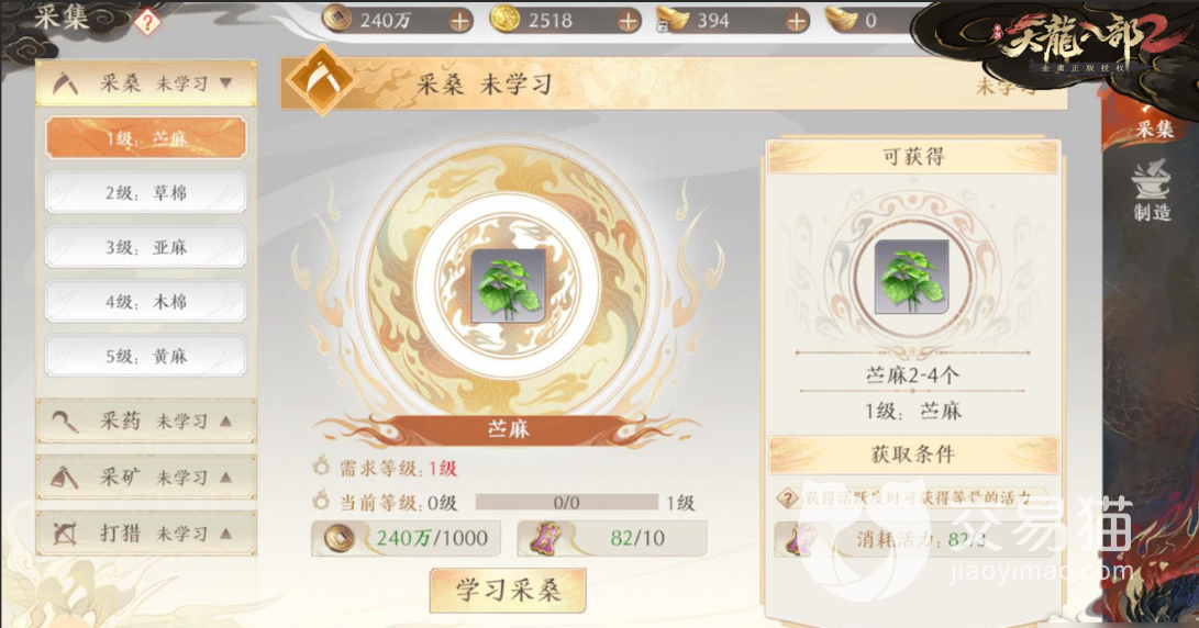 在采集系统里又分为采桑、采药、采矿和打猎。在采桑里可以采集苎麻、草棉、亚麻、木棉等,在采药里可以采集白英、蒲黄、三七、首乌等,在矿石里可以采集铁矿石、铜矿石、银矿石、金矿石等,打猎中可以采集普通轻皮、优质轻皮、普通中皮、优质中皮等。等级越高采集的越多,我们可以通过铜钱和活力来升级。这些物品在游戏中还是比较好采集的。