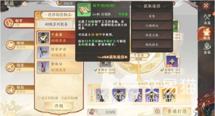 在采集到一定的物品后就可以制造武器和服装了,我们可以根据采集到的不同物品制造出不同的东西,比如采桑里我们主要可以制作衣服、裤子、帽子等服装类,采药里我们主要可以制作药丸,用于补气补血提高生命力。采矿就是我们武器的主要来源,可以用不同的矿石制造出防御和伤害力不同的武器和装备。通过打猎可以获得动物的皮毛,制作手套、鞋子等御寒衣物。制作时需要消耗一定的材料和图纸,图纸我们可以通过打怪和商城购买。