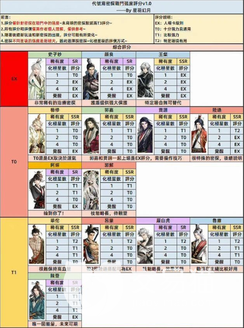 在最开始的时候,我们要了解卡牌角色的强度以及我们组队的思路,首先第一层是EX级别的人物,即颜良、王粲、史子眇、郭解、郭嘉、和杨修;玩家们通过自己的游戏体验可以感觉出以上角色的厉害程度,可以说这些角色的强度和功能性是十分优秀的了,不仅攻击能力强悍,泛用性也非常不错,功能性强,如果玩家抽到这样角色的话就可以直接培养起来然后查漏补缺进行配队。