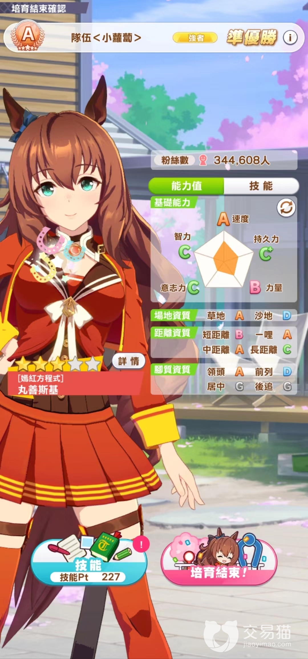 训练主要是以速度和智力为重心,持久力和力量可能会不足,所以推荐透过继承因子来提升属性值。另外最好再透过继承距离资质的因子提高中长距离的距离资质,培育会更加轻松。