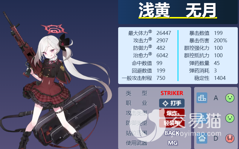 浅黄无月的定位是前排输出角色,攻击类型是爆炸,防御类型则为轻装甲。擅长在城镇和户外作战的浅黄无月在面对室内站时显得有些乏力。她的初始面板中,暴击伤害数值尤为突出。玩家们可以通过在常驻池中抽取以及扫荡困难关卡13-2和16-2获取神名文字碎片得到这名角色。各位玩家们在浅黄无月的培养过程中,可以按照角色等级-装备-技能等级-角色星级-爱用物的顺序进行培养,接下来给大家介绍一下浅黄五月的技能效果。