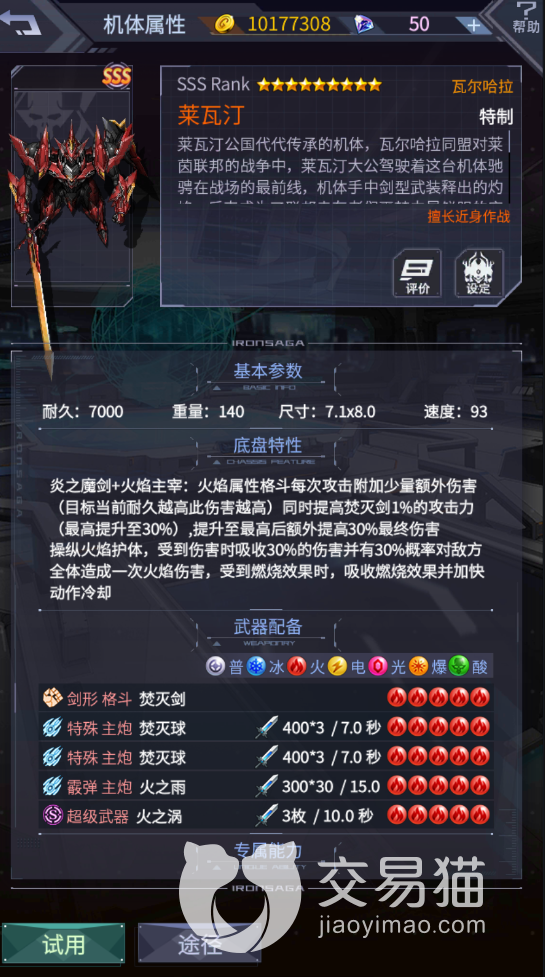战队的一号机甲名称叫做莱瓦汀机甲,这个的技能叫做火魔之剑和火焰主宰。在火属性的强化攻击下都会附赠爆炎攻击,武器的耐久度越高,相应的武器伤害增幅就越高,最后的伤害增幅甚至能达到百分之三十,并且在受到火焰伤害以后,就能减少冷却效果,这也是莱瓦汀能够被称为机甲第一的原因,玩家赶紧冲就行了。