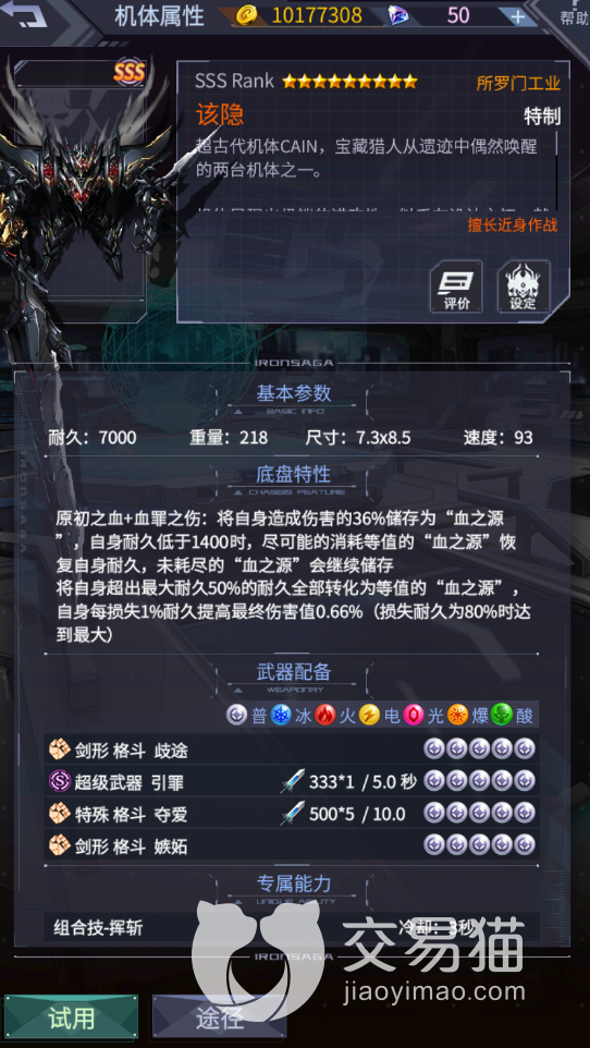 下一个则是机甲该隐。这款机甲神同西方诸神的名称,这款机甲的技能叫做原初之血和血罪之伤。每损失百分之一的血量就会提升百分之十的攻速,可以说是血量越低,攻速越快。这款机甲适合无限压血流,基本上在游戏中属于无解级机甲,但是要注意千万别把血量压得太低。